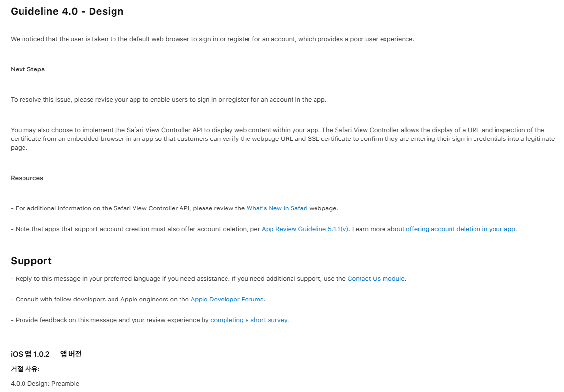 애플 앱스토어 심사에서 사용자 경험을 해친다는 사유로 리젝을 받게 되었습니다. 애플의 심사가 구글의 심사에 비해 월등히 빡세다는 소문을 몸소 체감할 수 있는 순간이었습니다. 심사 결과 내용 중에는 앱에서 url 을 직접 여는 경우에 iOS의 인앱 브라우저 API 인 Safari View Controller 를 사용할 것을 권장하고 있었습니다.