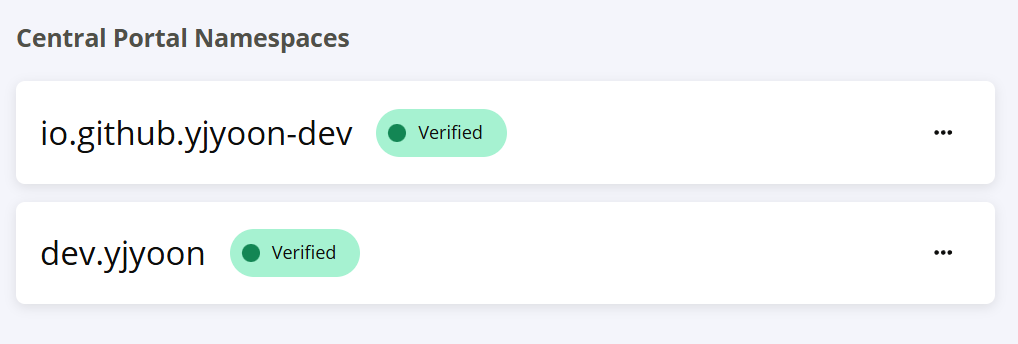 제 생에 첫 라이브러리 배포였기 때문에, Maven Central 에 계정을 만드는 것이 첫 번째 작업이었습니다. 항상 누군가가 만든 라이브러리를 확인하러 오는 곳이었는데 이렇게 직접 계정을 등록하니 감회가 새로웠습니다. Namespace 의 경우 깃허브 계정으로 로그인하면 io.github.username 을 기본적으로 제공하지만, 저는 yjyoon.dev 도메인을 직접 갖고 있었기 때문에 이를 등록할 수 있었습니다.