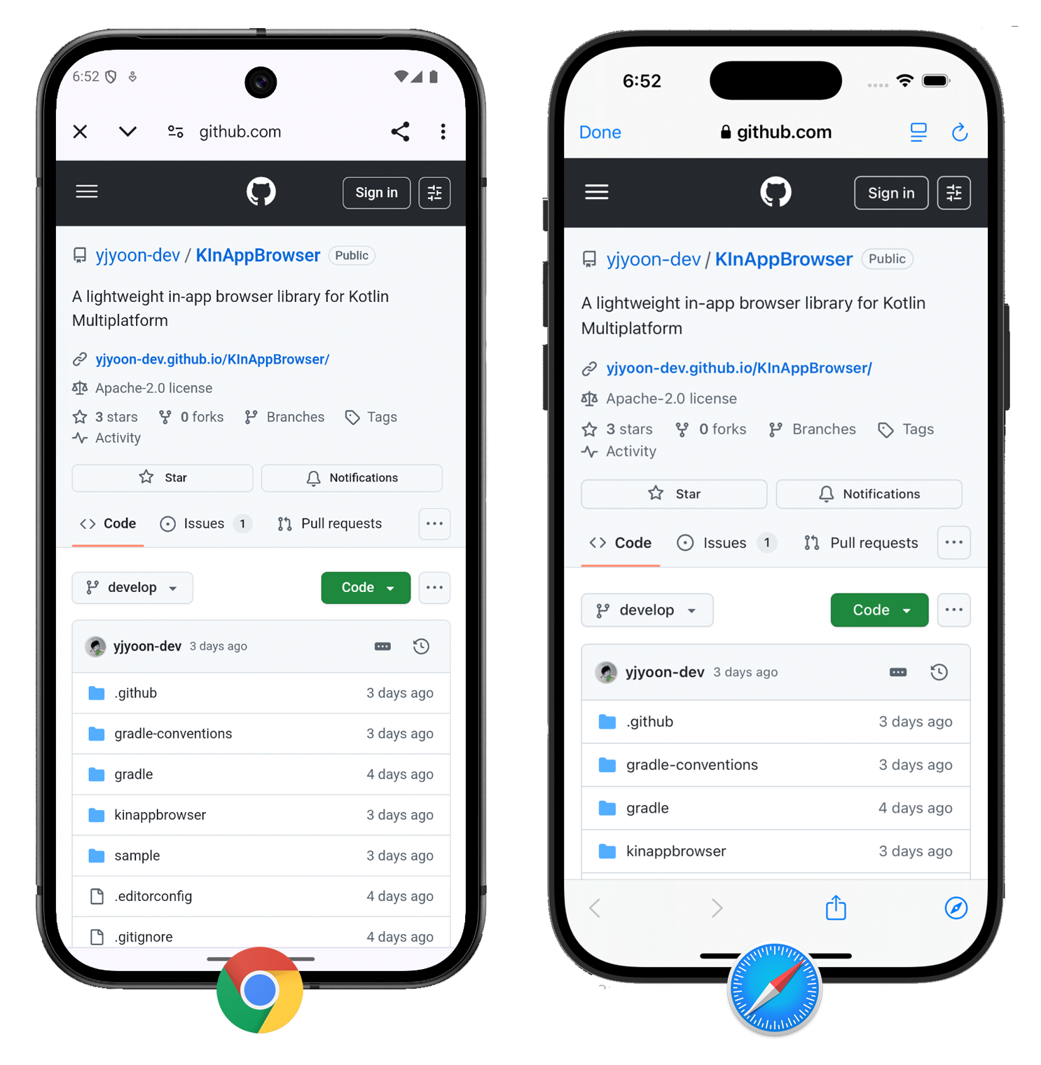 이렇게 제 첫 오픈소스 라이브러리 KInAppBrowser 가 배포되어 Kotlin Multiplatform 커뮤니티에 기여할 수 있게 되었습니다. 언젠가 한 번 직접 만들어보고 싶다는 막연한 생각만 있었는데 이렇게 직접 만들고 배포까지 하니 그 뿌듯함이 정말 큰 것 같습니다. 앞으로도 오픈소스와 Kotlin 커뮤니티에 많이 기여할 수 있으면 좋겠습니다. 읽어주셔서 감사합니다!
